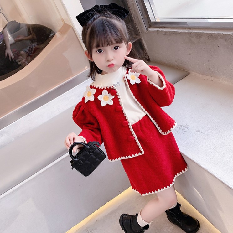 C1-109 聖誕新年小香風羊毛拉架花外套加裙套裝
